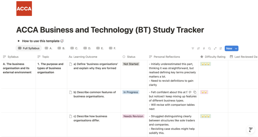This isn’t a textbook — and it’s not trying to be.Instead, it gives you a clear roadmap of everything ACCA expects you to know, in a format that’s interactive, visual, and customisable. Whether you're using Kaplan, BPP, OpenTuition, or the Study Hub, this template helps you: