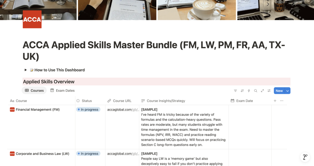• Course Overview Dashboard – Track all 6 Applied Skills papers (FM, LW, PM, FR, AA, TX-UK) at a glance ✅