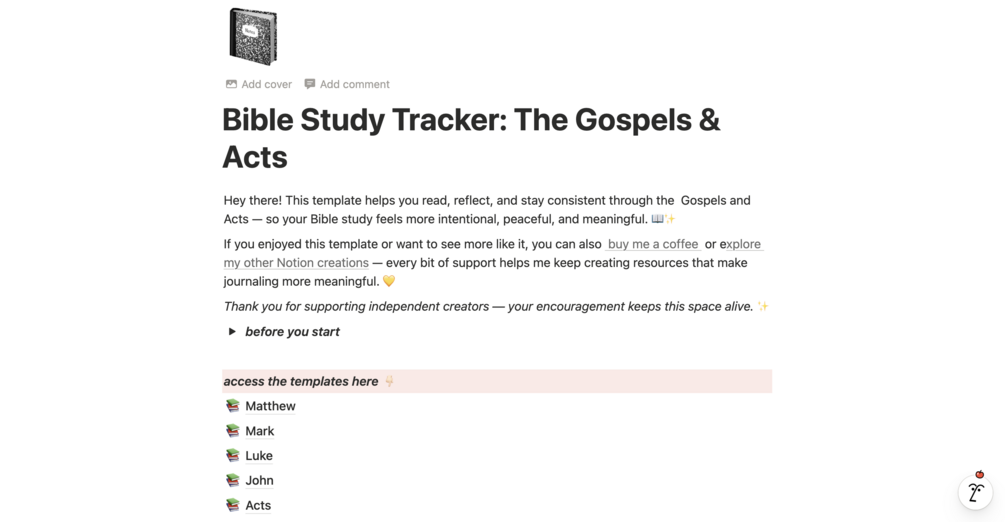 Journey through the heart of the New Testament with this beautifully organised Bible Study Tracker Bundle. Designed for Matthew, Mark, Luke, John, and Acts, this template gives you a peaceful, structured space to study Scripture with clarity, consistency, and deeper reflection.