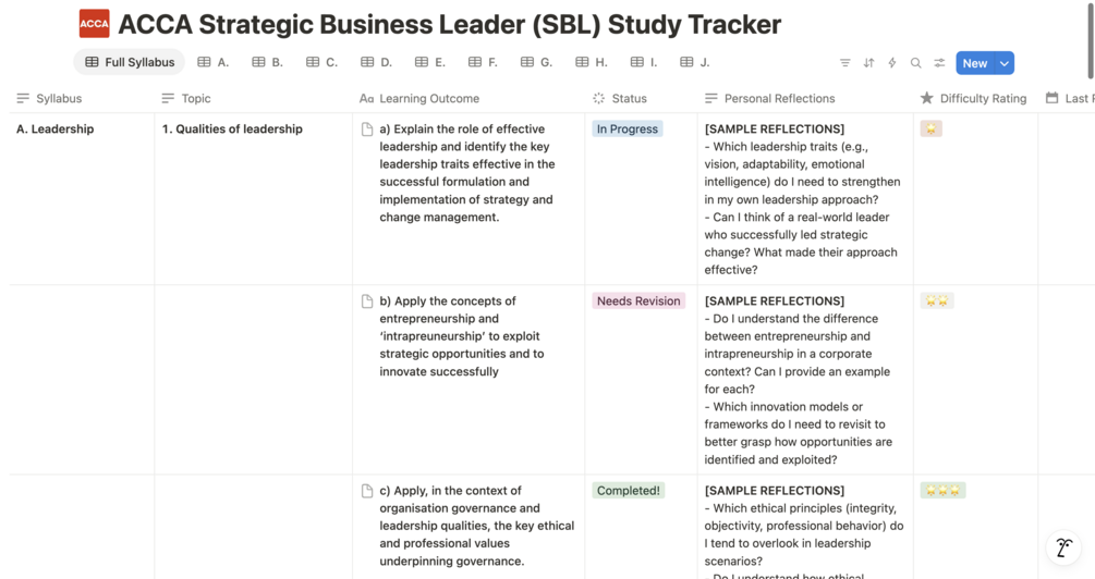 ACCA Strategic Business Leader (SBL) Notion Study Tracker